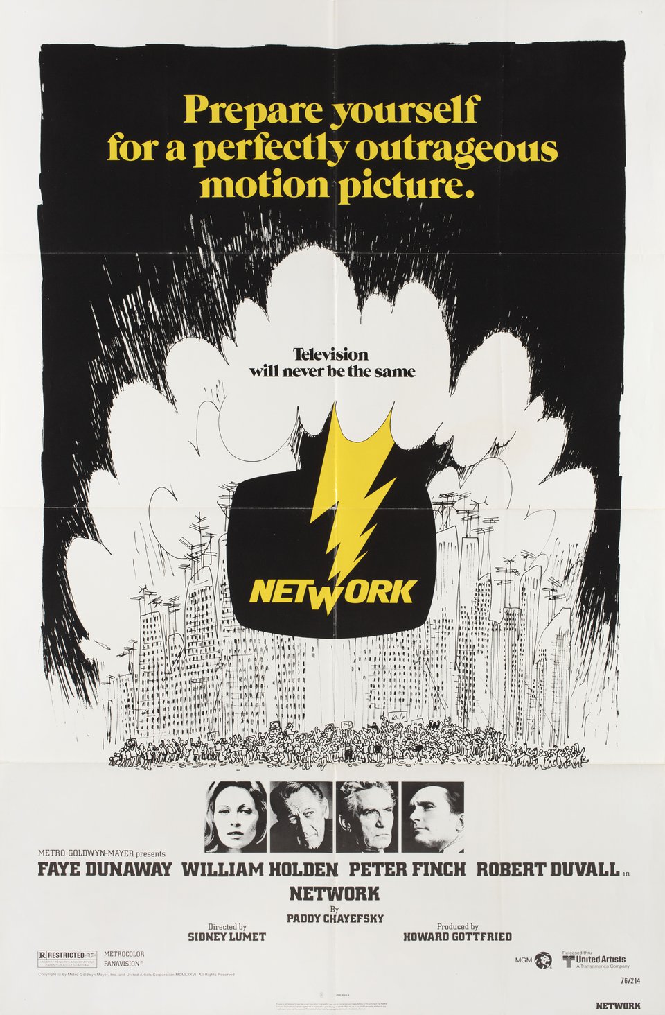 Network is a 1976 American satirical comedy drama film directed by Sidney Lumet and written by Paddy Chayefsky. It depicts a television network struggling with poor ratings until the nightly live broadcast of its longtime news anchor Howard Beale (Peter Finch) inadvertently showcases his breakdown into increasingly psychotic behaviour, which makes his show a surprise hit. Alongside Finch (in his final role), the film stars Faye Dunaway, William Holden, Robert Duvall, Wesley Addy, Ned Beatty, and Beatrice Straight. Produced by Metro-Goldwyn-Mayer and released by United Artists on November 27, 1976, Network was a commercial success, earning $23.7 million on a...
